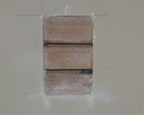 Notice that the corners still have small bits of the scratch coat remaining. That and the fingers between the lath are easier to remove with a flat blade screwdriver, stiff putty knife or even a utility knife. Then as we did in the recessed lighting article we use a RotoZip or Dremel tool and wood zip bit to cut out the lath. This creates far less vibration than any other method I used.